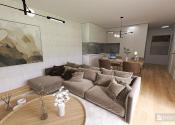 Priestranná obývacia izba s kuchyňou (34,86 m²) a výstupom na veľkú terasu (37,6 m²).