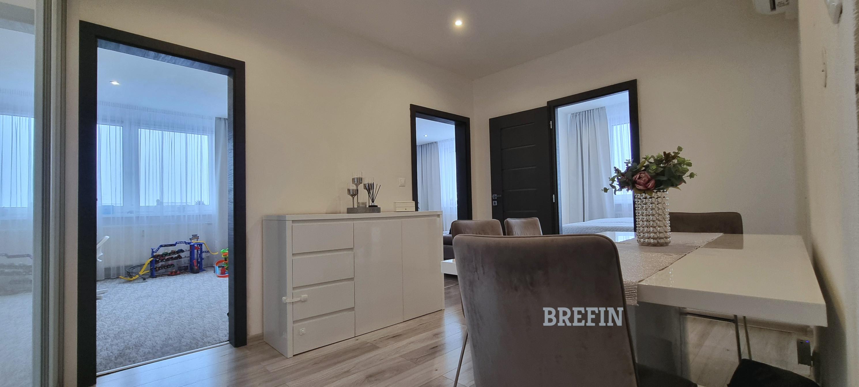 DOHODA MOŽNÁ-Ponúkame na predaj veľmi vkusne kompletne zrekonštruovaný 3-izbový byt na Smolenickej ulici v Petržalke na 12/12 poschodí s klimatizáciou, zasklenou loggiou a výborne riešenými úložnými priestormi. Byt je pripravený na okamžité bývanie bez investícií, má pekne presvetlený interiér, znížené stropy so zabudovaným osvetlením a vďaka najvyššiemu poschodiu ponúka súkromie a príjemný výhľad.